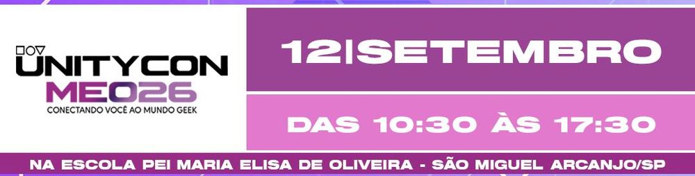 Estaremos celebrando a 5 edição do evento Unity Con MEO 26 e inédita na cidade de SÃO MIGUEL ARCANJO, na escola @pei.mariaelisadeoliveira_ com o puro suco de evento geek, com Cosplay, RPG, atrações e muito mais!